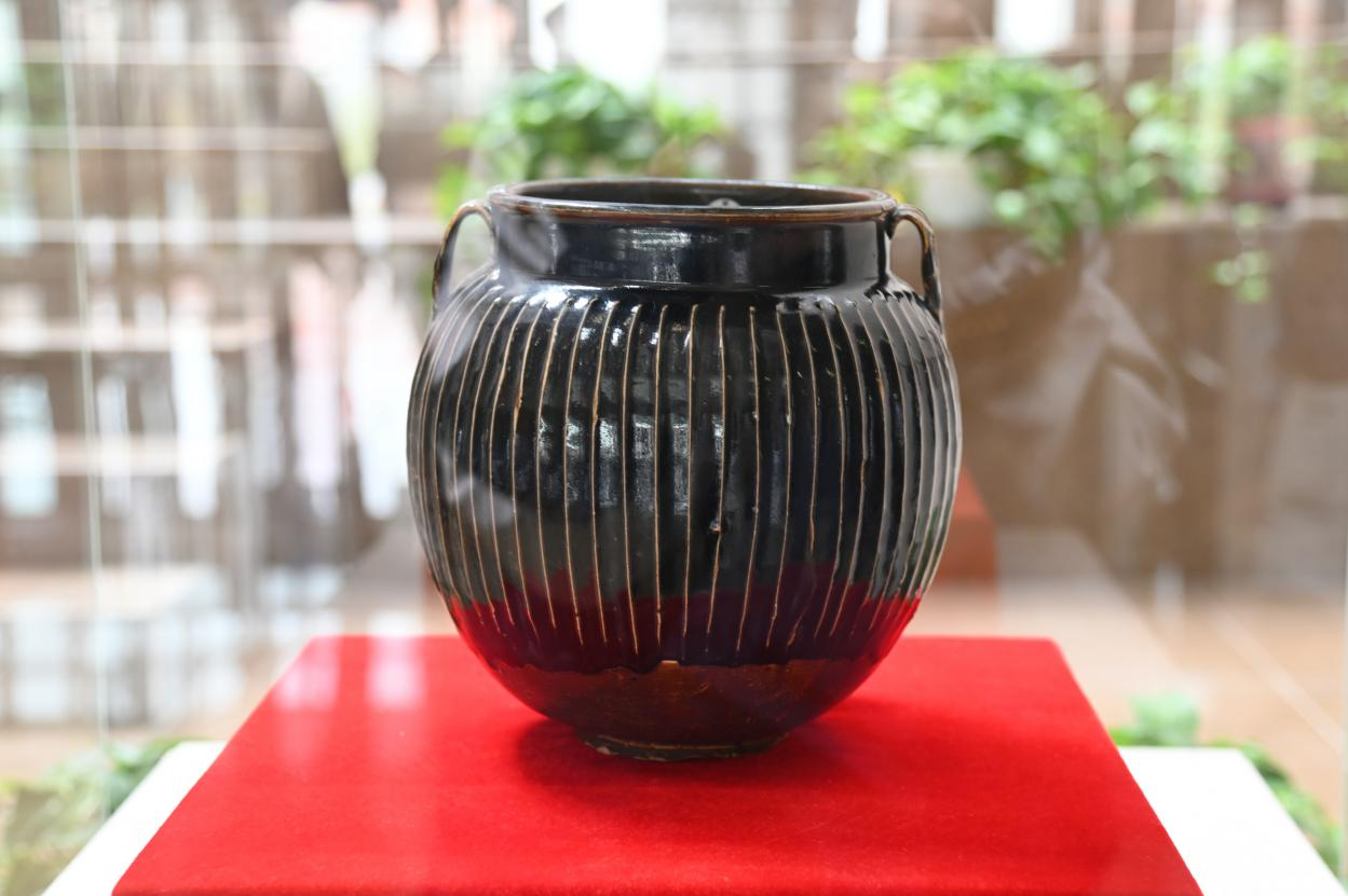 方辉介绍了此次文物捐赠情况。黑釉线条罐是宋金时期我国北方磁州窑系的典型器物,以其黑釉工艺和沥粉工艺而闻名。翟健民先生捐赠的此件金代黑釉线条罐,高25.5厘米,是目前已知同类器中体量最大的一件完整器,经专家鉴定,为磁州窑系作品,具有较高的艺术价值和收藏价值,填补了学校博物馆藏品的缺环。
